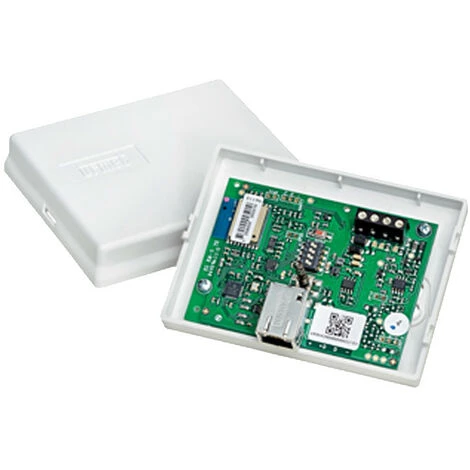 L’interface se connecte au bus, est équipée de dip-switches pour l’adressage et se connecte au réseau local par WiFi ou câble Ethernet.