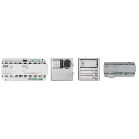 KIT colonne urmet vidéo sinthesi stell 2VOICE composé de : 1 pièce 1083/64 (Endroit extérieur audio sinthesi Steel avec 2 boutons), 1 pièce 1083/50 (Interface de colonne, Dispositif utilisé pour désaccoupler les colonnes montantes en installations 2 voies complexes, prévu pour le montage sur barre DIN 10 modules), 1 pièce 1083/20A (Alimentateur 2 voies), 1 pièce 1758/83 (module vidéo sinthesi Steel).