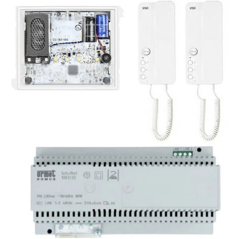 Kit de base Système urmet Alpha seulement Audio système 2 Voice composé de : 1 pièce seul extérieur place audio 1083/38 Equipé de haut-parleur et microphone – 1 pièce alimentation 2voice 1083/20A – 2 interphones Miro 2voice (1183/5) Équipé d’un bouton d’ouverture de porte (rétro-éclairé) et de 3 boutons supplémentaires pour des fonctions supplémentaires (ouverture seconde entrée du carrier, allumage des lumières d’escalier, appel au standard, appel intercommunal, etc)